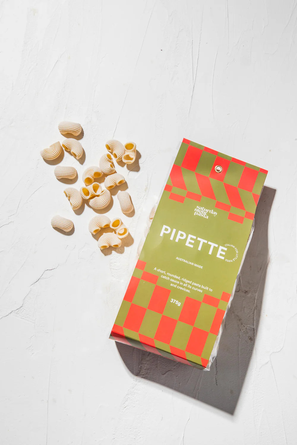 In Italian, Pipette translates to “little pipes”. It is a short, rounded, ridge pasta built to capture the sauce in all its curves and crevices. Made from Australian, durum wheat semolina from the “Golden Triangle” area of NSW for Saturday Night Pasta.